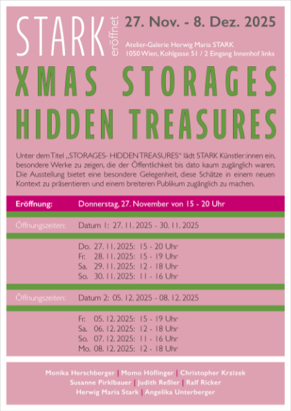 Unter dem Titel „STORAGES – HIDDEN TREASURES“ lädt die Atelier-Galerie Herwig Maria Stark in Wien zu einer besonderen Gruppenausstellung ein. Gezeigt werden Werke von sieben Künstlern:innen, die bislang kaum öffentlich präsentiert wurden. Die Ausstellung bietet dem Publikum die seltene Gelegenheit, diese „Schätze aus dem Lager“ in einem neuen Licht zu entdecken – jenseits etablierter Präsentationsformen und kuratorischer Routinen.